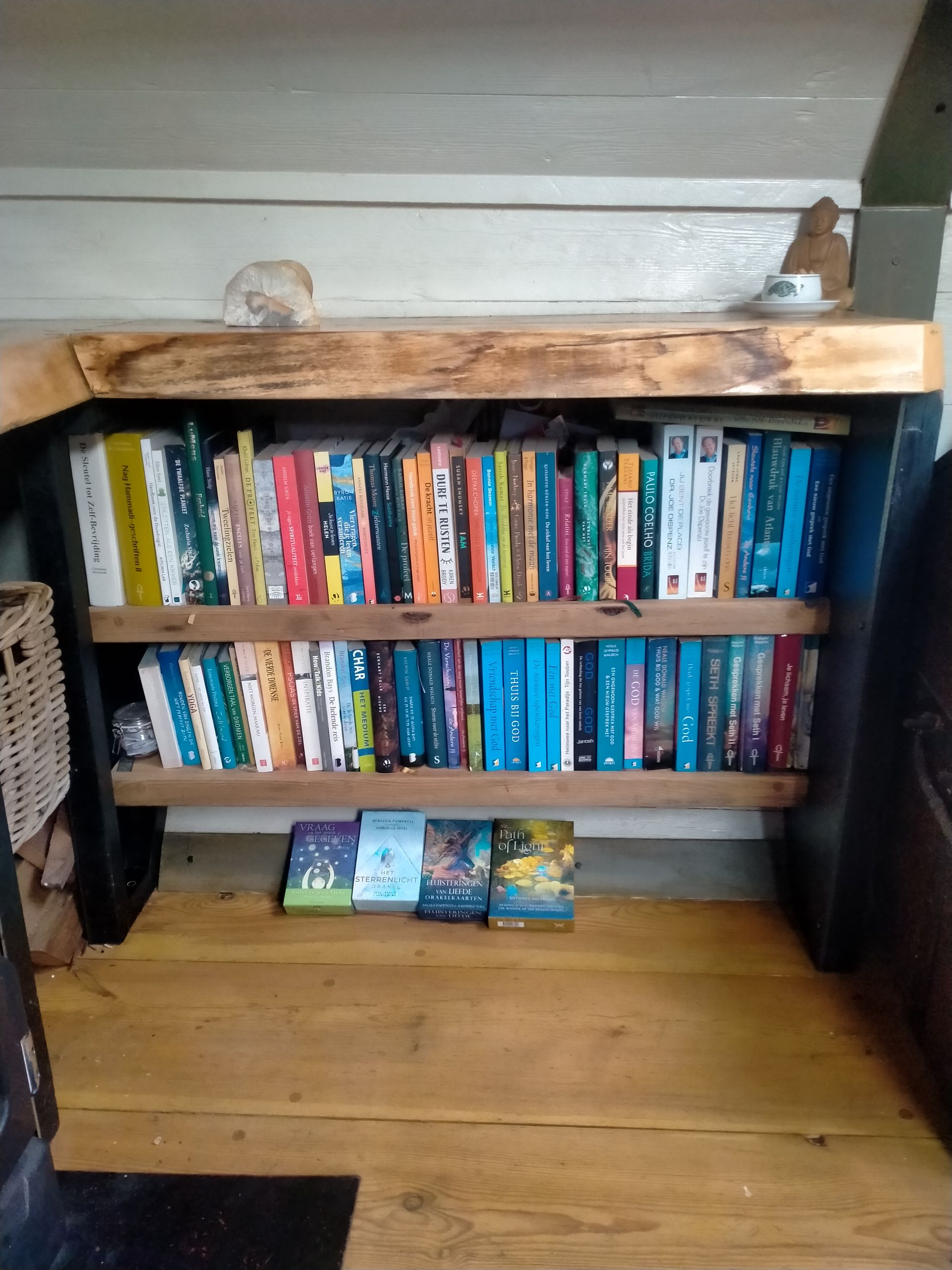 Inmiddels hebben we aardig wat boeken in onze kast staan. Graag willen we dat deze kennis en inzichten voor iedereen toegankelijk is. Daarom is het bij ons mogelijk om een boek te komen lenen. Je betaald 20 euro borg en krijgt dat weer terug als het boek uitgelezen is. En wie weet komt daar weer een mooi gesprek uit voort.